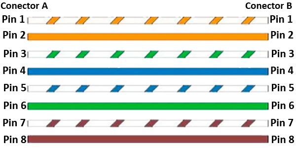 Los colores de un cable de red directo no cambian su dirección. Ambos extremos utilizan el mismo estándar de cableado (T-586-A o T-568-B). Así, el Pin 1 del conector A se dirige al Pin 1 del conector B, el Pin 2 al Pin 2. Estos cables se utilizan para conectar ordenadores a switches, hubs o routers.